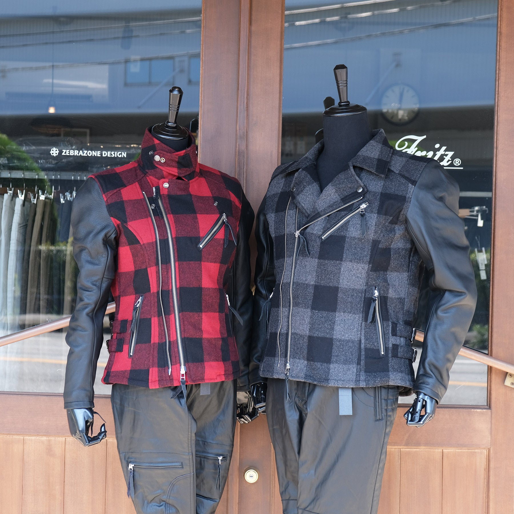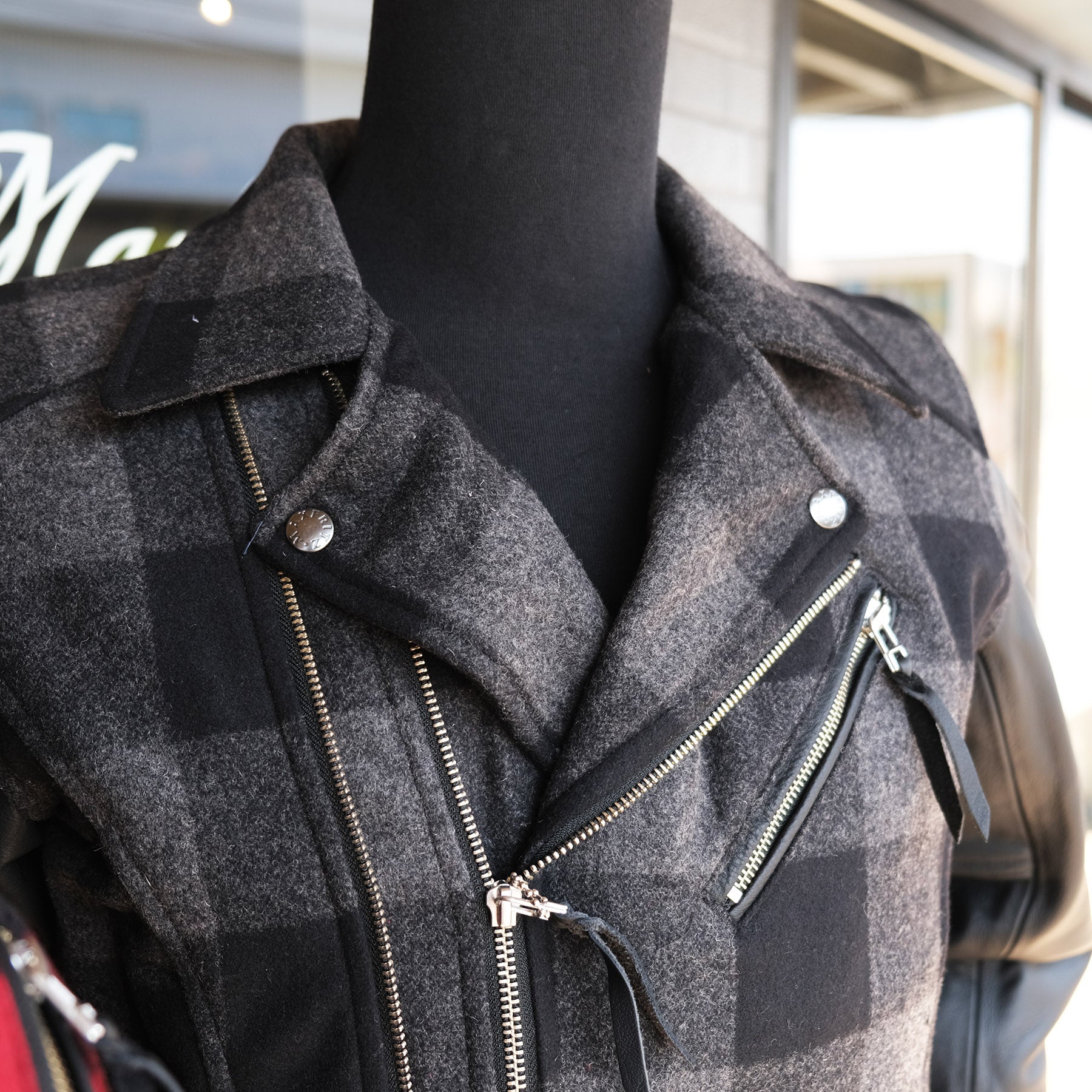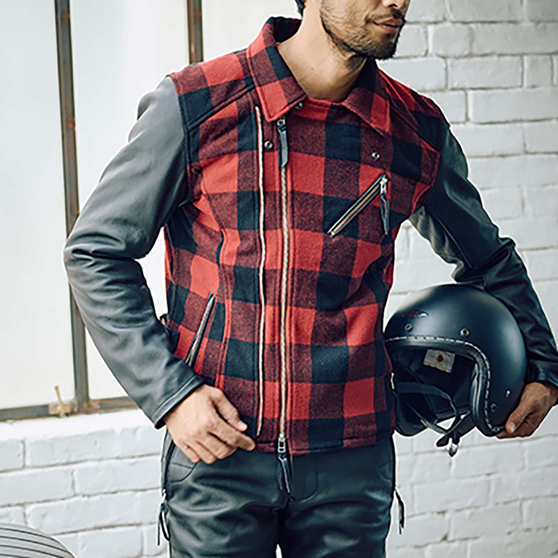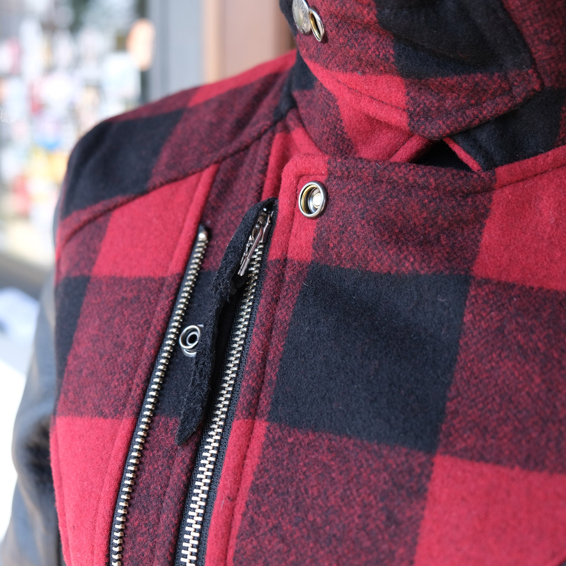 Pコートやダブルコートに使用されるようなウールメルトン生地はブロックチェック柄と相まってライダースジャケットとしては雰囲気は柔らかくなっています。