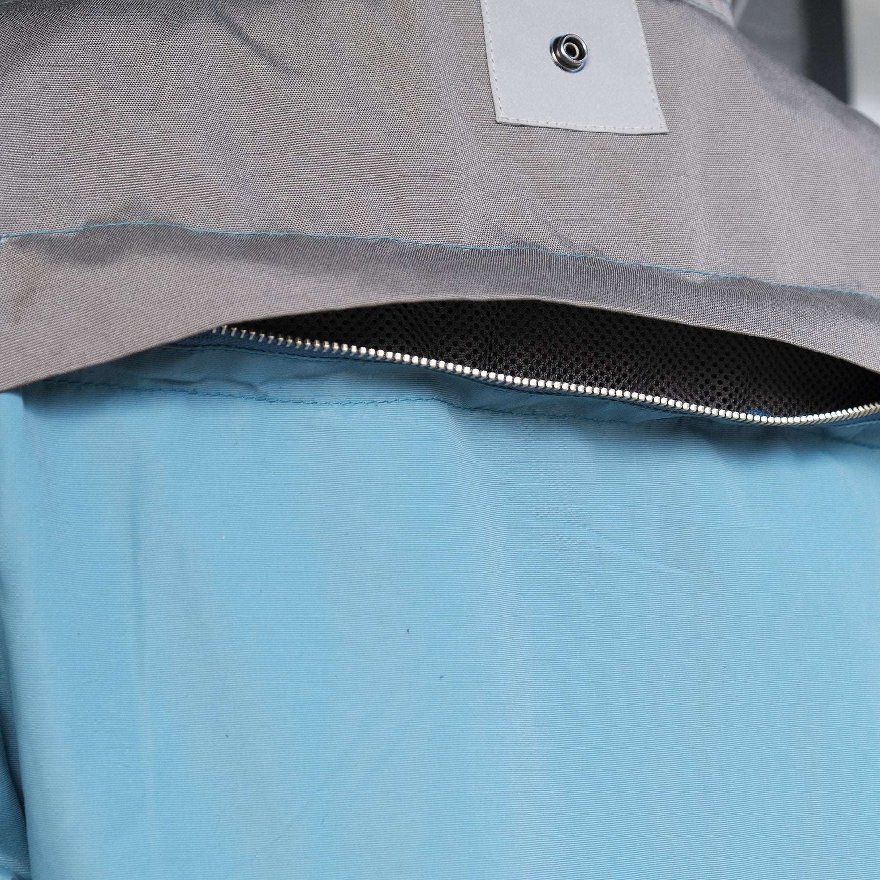 フロントはジッパーとボタンという構造で、暑い場合はジッパーを開けてボタンのみ閉じることで通気性を向上させることができます。