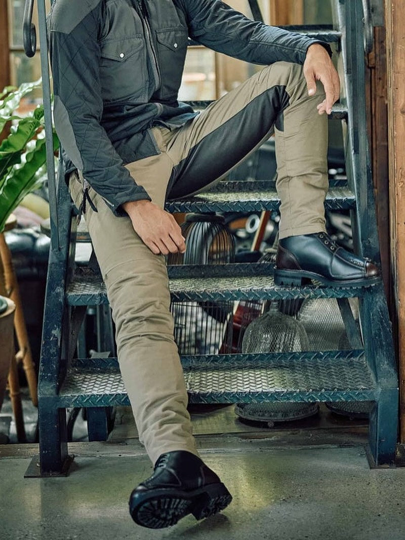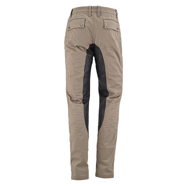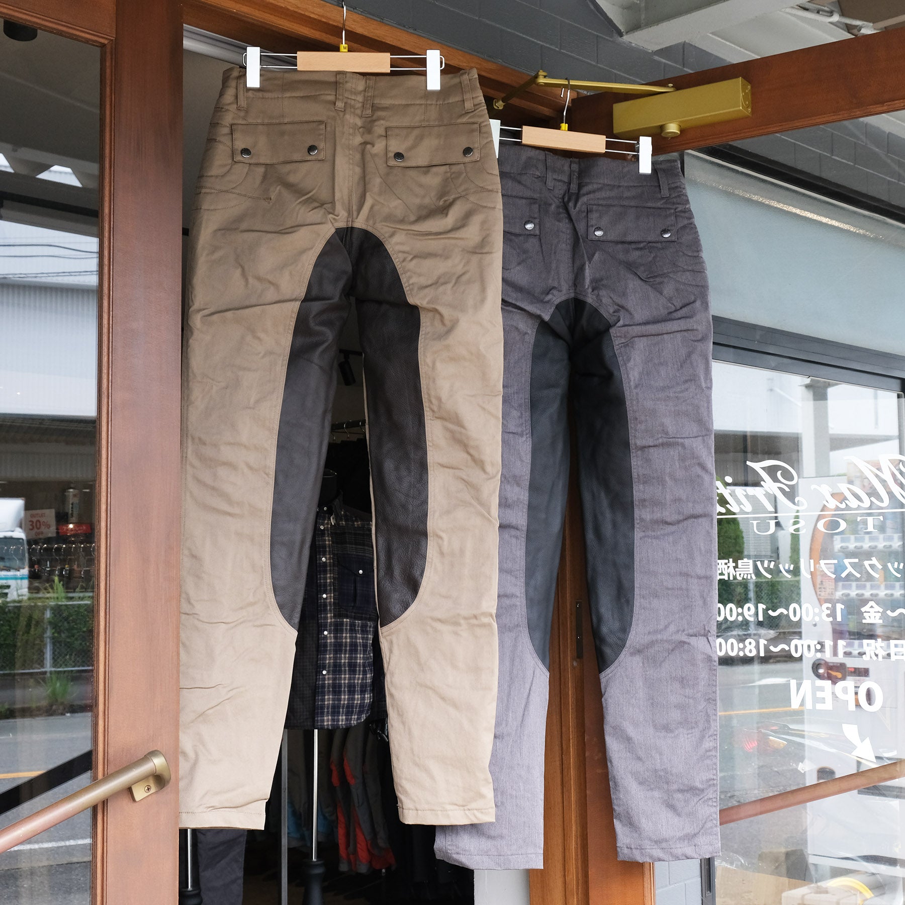 身頃は先染めのコットンツイルストレッチ生地にニーグリップやシートの滑り留めのために内股部分にウォッシャブルレザーを採用した