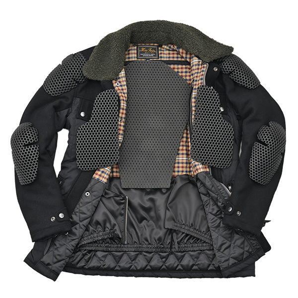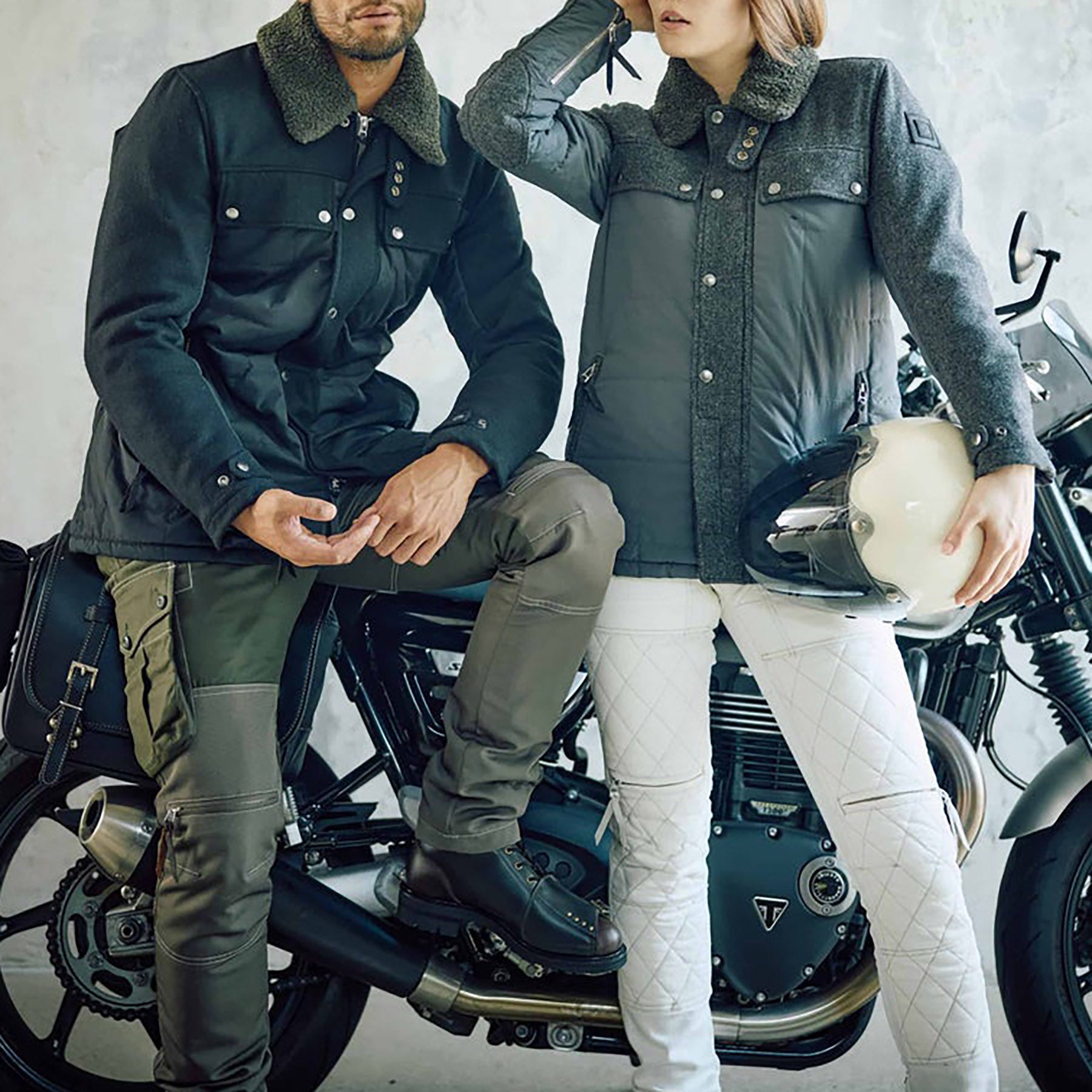袖は動きやすいピボットスリーブ、フロントのドットボタンがタンクに当たらないよう比翼仕立て(ボタンが隠れている)にしてあるなどバイク用としての基本性能もキープ。